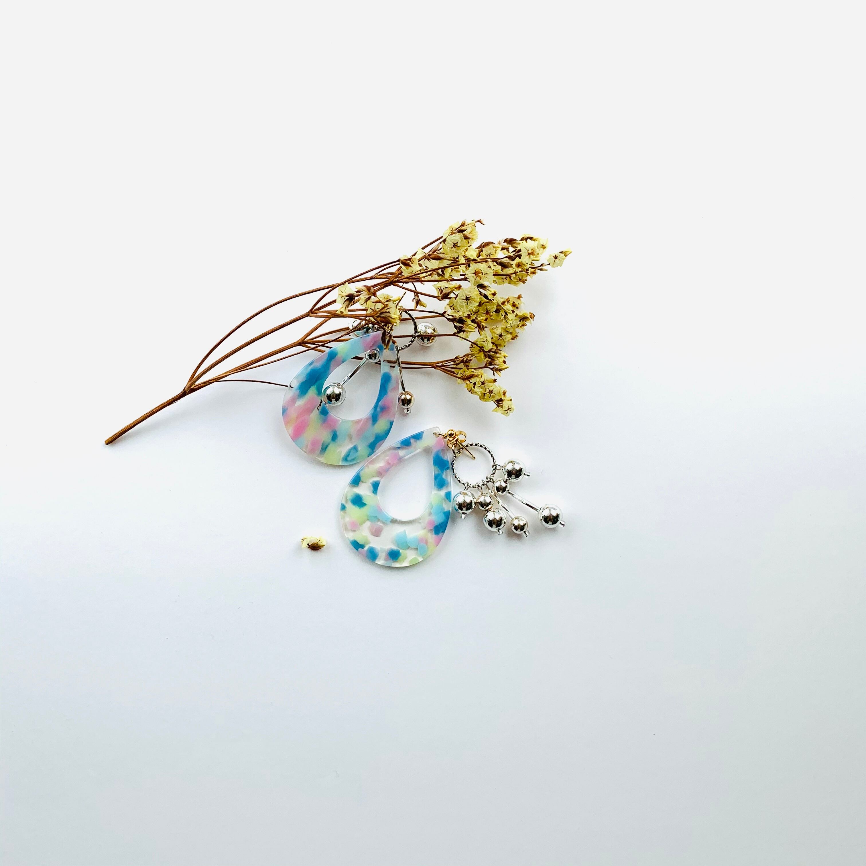 大きめクリアパーツからのぞくシルバーボールが印象の涼しげな耳飾りです。