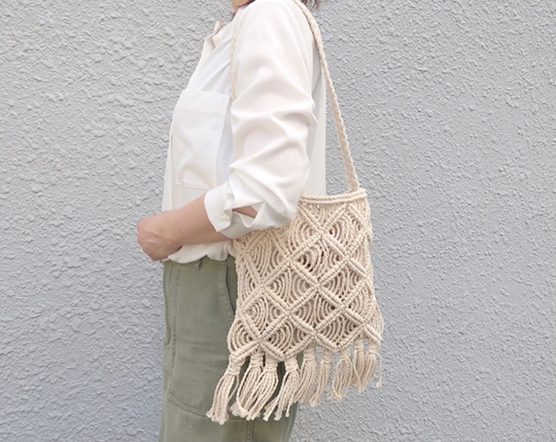 ハンドメイドで作られたマクラメバッグ。